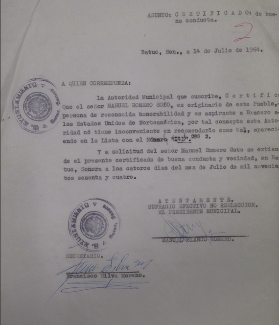 22 Manuel Blanco Romero a quien corresponda, Batuc, Sonora, 14 de julio de 1964. AGES, Oficialía Mayor, 345, n. 2085. Otra carta de este tipo es la de Heliodoro Hernández López. Perfecto Ruiz a quien corresponda, Nazareno Etla, Oaxaca, 24 de marzo de 1952. Ernesto Galarza Papers [EGP], Braceros, 19, n. 2.