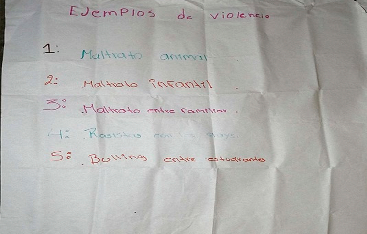 Referente a los resultados de la sesión hablemos de violencias, su objetivo era generar reflexiones sobre las violencias y sus implicaciones, por medio de diversas actividades discursivas, expresivas y lúdicas, bajo la lógica de que hablar de violencia es aceptar que existe y ese reconocimiento permite buscar vías colectivas e individuales para resolver conflictos sin utilizar la violencia. En ese sentido, importa que los niñas y niños sepan qué es la violencia, sus tipos y en general sus implicaciones, para que puedan reconocerla en su cotidiano y estar alertas ante ella.