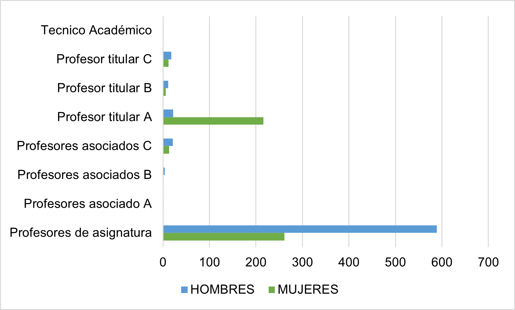 Aunque se podría pensar que hay una tendencia hacia la paridad entre el cuerpo docente destaca, como se podrá observar en la Gráfica 4, que sean las mujeres las que tengan más plazas bajo la categoría de profesora titular A y que en un número muy alto sean los hombres los que se desempeñen en mayor grado como profesores de asignatura. Desde mi perspectiva, esta distribución de labores docentes ha seguido un patrón de género y del proceso de formación tradicional de la arquitectura y el urbanismo, que enaltece ciertos atributos de quienes son las personas más adecuadas para enseñar estas disciplinas -reconocimiento por obra construida-; pero para comprender esto hay que revisar la normatividad y contrastarla con las prácticas institucionales y docentes.