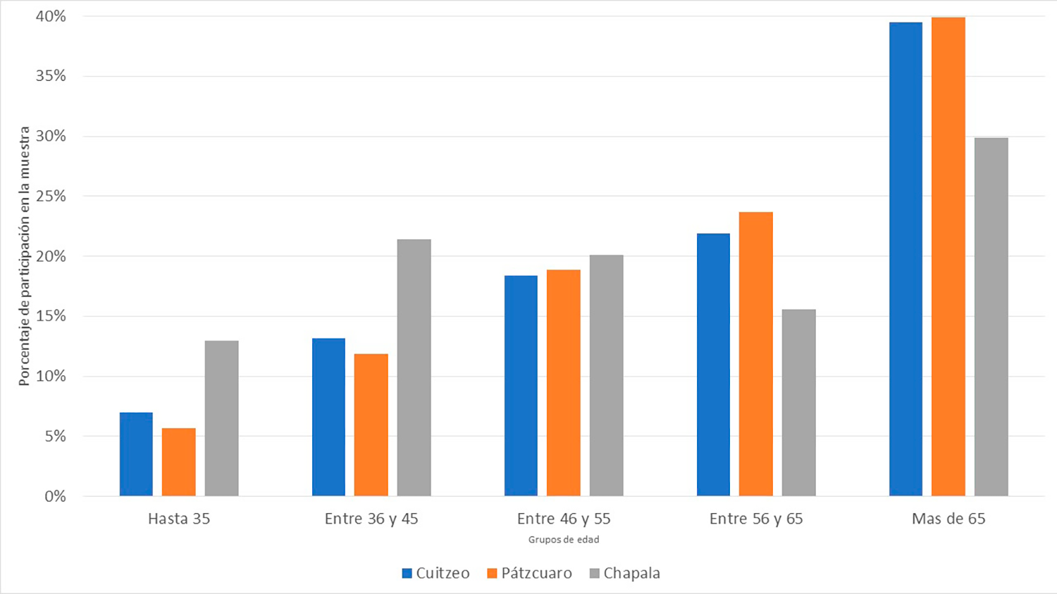 El 94% de las personas participantes en el estudio fueron masculinos y destaca que del 6% femenino restante, 5 % estuvo localizado en la RP y el 1% en RC. El promedio de años de escolaridad en RC fue de 4.7, en RP, de 5.4 y en RCH de 7.6. La mayoría de las personas que atendieron la encuesta (63%) tiene más de 56 años; la RC y RP presentaron una distribución etaria y promedio de edad muy similar (59.4 y 59.7 respectivamente). Por su parte, en la RCH las personas encuestadas cuentan con una edad promedio de 55.5 años. En los tres casos el grupo más numeroso fue el de más de 65 años; sin embargo, en la RCH el segundo que más casos agrupó fue el de entre 36 y 45 años, a diferencia de las otras dos regiones en las que el grupo siguiente fue el de entre 56 y 65 años (Figura 4).