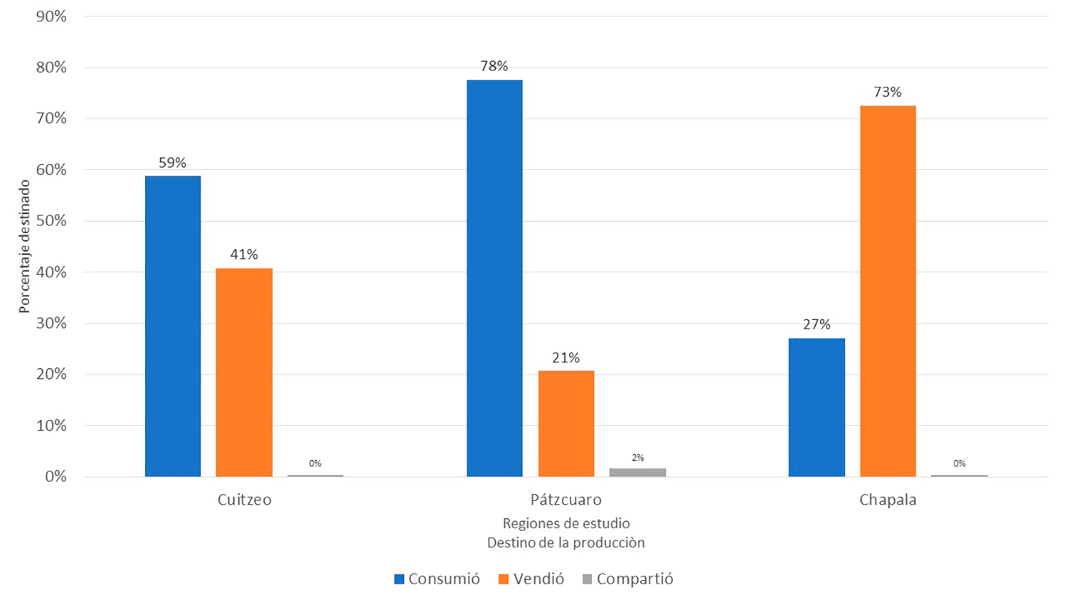 Con respecto al destino de la producción de maíz, destaca que en la RCH la mayor parte de la producción (73%) se destina a la venta, mientras que en RC y RP la producción se destina principalmente al consumo. Cabe destacar que en la RP la mayoría (77%) de la producción se destina al autoconsumo e incluso fue la única región en que se mencionó que un pequeño porcentaje (02%) se comparte con familiares, amigos o vecinos de las localidades (Figura 5).