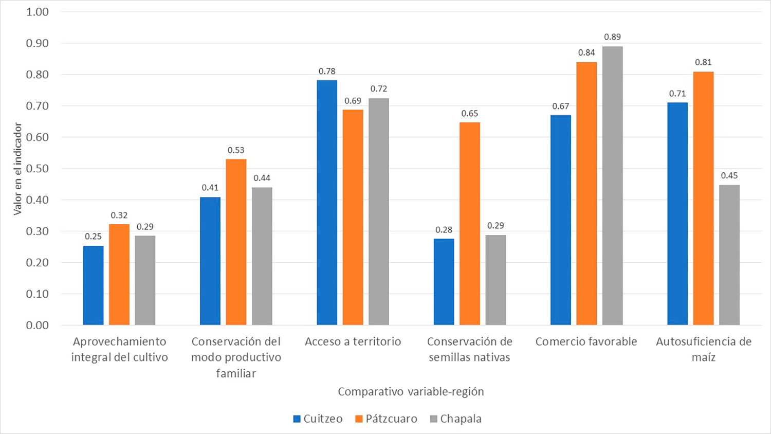 La aplicación de las comparaciones múltiples mediante la pruebas post hoc de Tukey y Games-Howell (p<0.05) mostró que el “aprovechamiento integral del cultivo” es mayor en RP que en RC; respecto a la “conservación del modo de producción familiar” sucede en mayor medida en RP que en RCH y RC; en cuanto al “acceso al territorio”, la RC muestra mejores condiciones con respecto a RC y RP; acerca de la “conservación de semillas nativas”, la RP realiza prácticas de conservación con notoria superioridad a la RCH y RC; sobre las condiciones de “comercio favorable”, la RCH mantiene valores superiores sobre RP y RC; por último, sobre la “autosuficiencia de maíz”, la RP muestra mayor soberanía respecto a la RC y RCH.