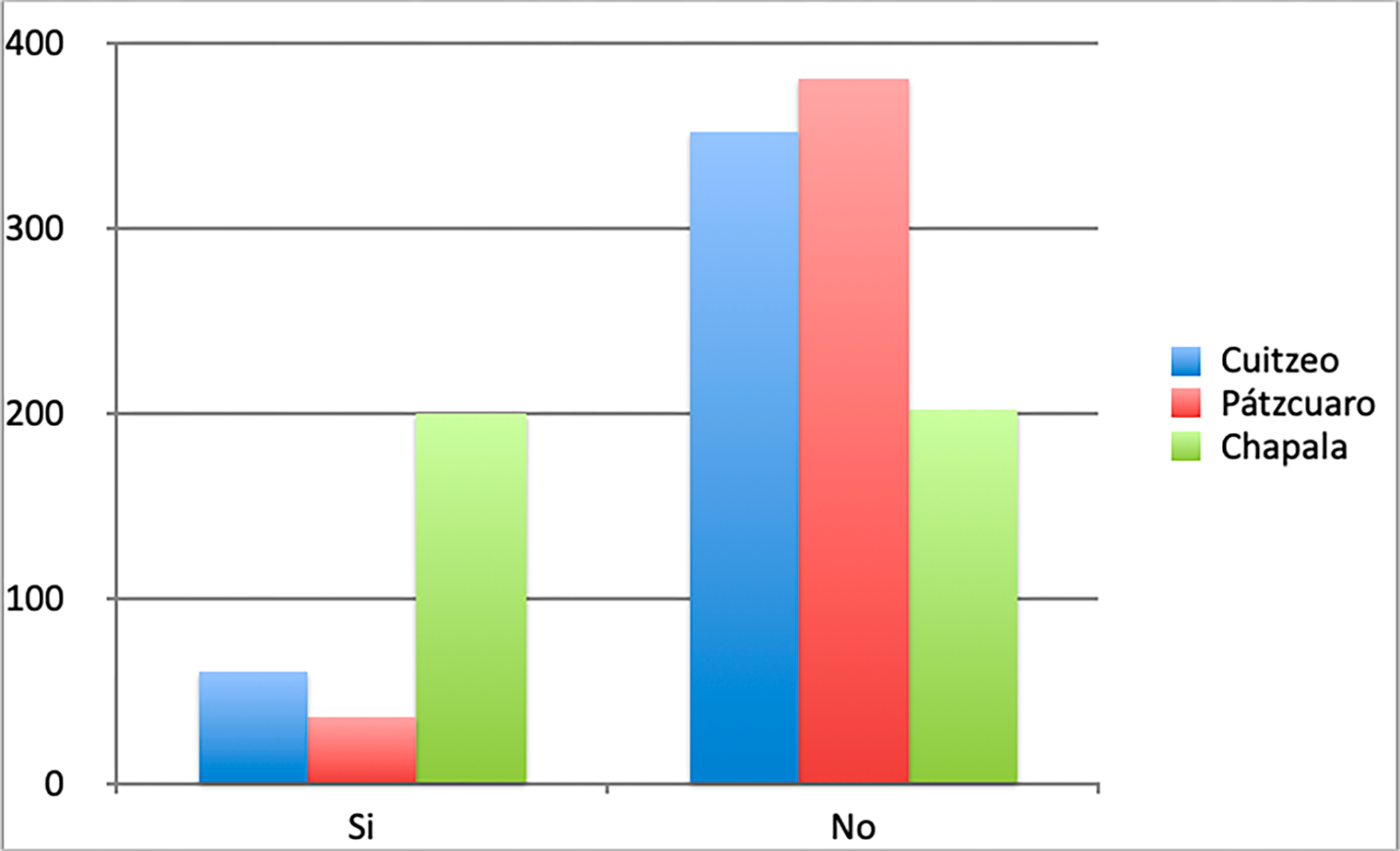 En el Gráfico 2 se observa que el 75% de los entrevistados contestó no tener acceso a agua potable en su lugar de trabajo; en tanto, el 25% señaló sí contar con este recurso. Comparando a las tres regiones, Chalapa posee mejores condiciones, ya que la mitad indicó que sí tenía acceso a agua potable, a diferencia a Pátzcuaro y Cuitzeo, en donde más del 85% respondió negativamente [Ver Gráfico 2].