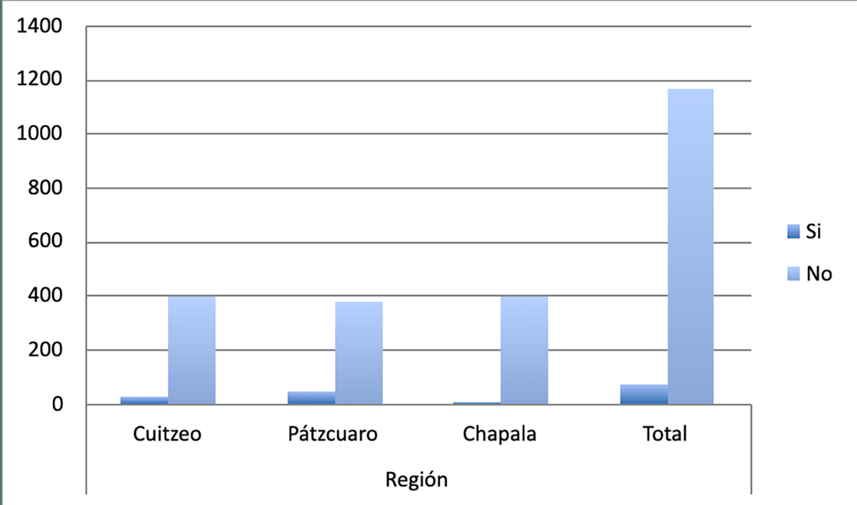 La inclusión social también contempla la participación de mujeres la pesca y el cultivo de maíz. En el trabajo de campo, se encontró poca participación femenina en la actividad agrícola y pesquera. Aunado a lo anterior, la condición física de una joven embarazada requiere de un esfuerzo adicional para incorporarse al desarrollo laboral, puede considerarse dentro de los grupos vulnerables (Centro de Estudios Sociales y de opinión pública, 2009). En esta investigación se preguntó si las mujeres en condición de embarazo apoyan en las actividades productivas y 70 de los entrevistados (6%) contestaron afirmativamente. Al comparar por regiones, encontramos mayores casos de participación femenina (vulnerable) en las actividades productivas de la región de Pátzcuaro, seguido de Cuitzeo y Chapala [Ver Gráfico 4]. Las actividades que realizan son principalmente limpiar y vender pescado y lavar redes; seguido de actividades de campo, hogar, comercio y hule.