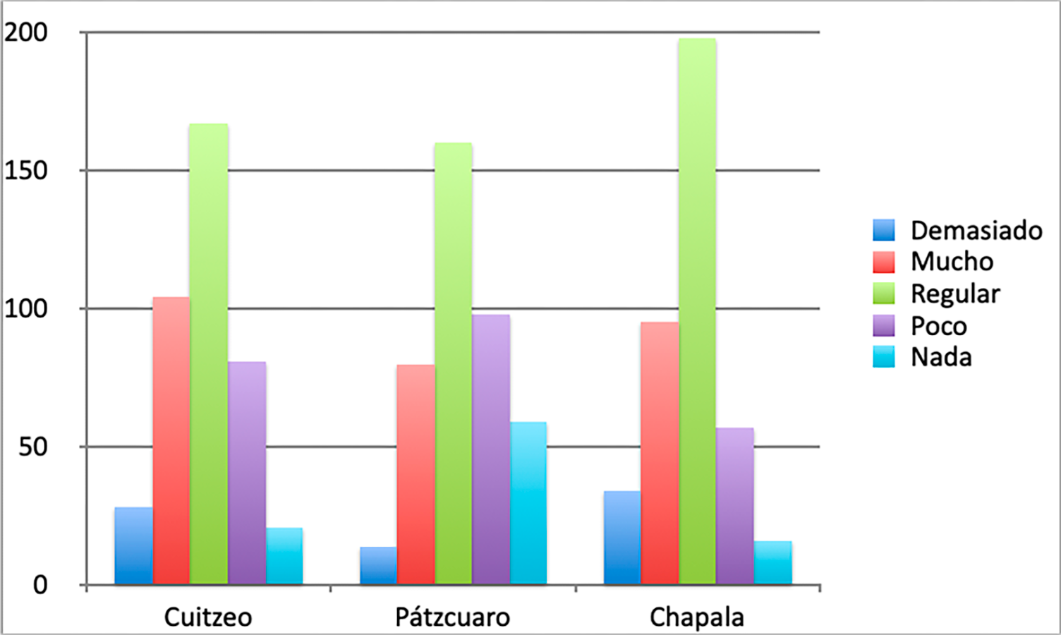 Por región, en el lago de Cuitzeo la percepción es más positiva, ya que 33% de los entrevistados consideran que la actividad que realizan ha ayudado “mucho” y “demasiado” en mejorar el nivel de vida de las personas de su comunidad. En cifras similares se encuentra la percepción en el lago de Chapala (32%). Por otro lado, la del lago de Pátzcuaro, sobre el impacto que genera la actividad que realiza en el beneficio de la región, es negativa, ya que 38% contestó que poco y nada y solo 23% que “demasiado” y “mucho” [Ver Gráfico 5].