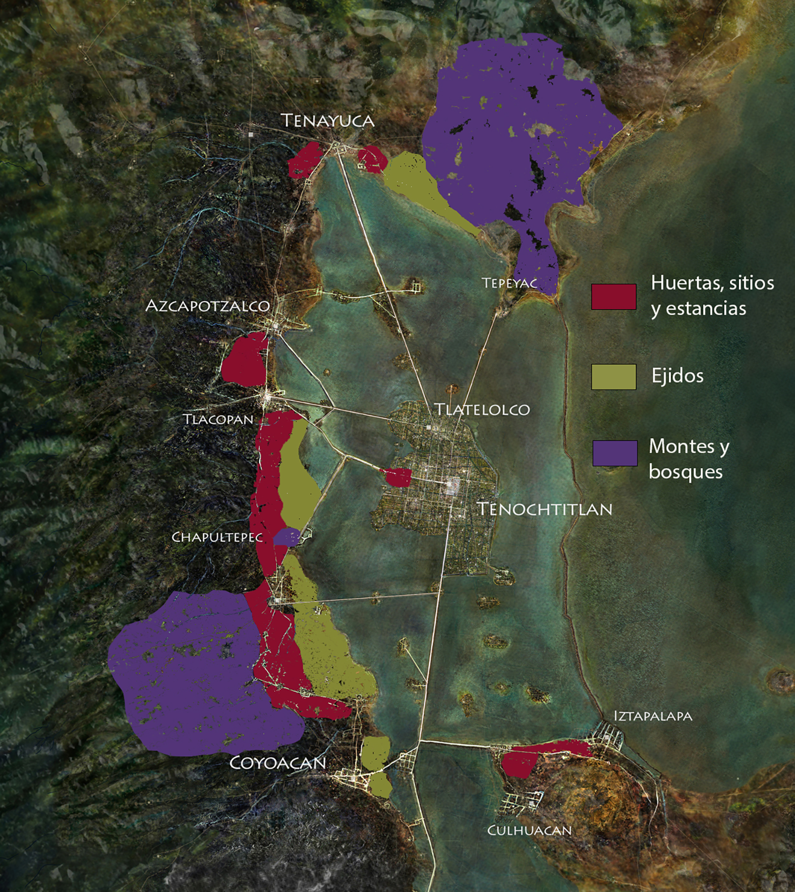 Los términos de la ciudad de México se fueron construyendo sobre los territorios de varios altépetl en la ribera occidental del lago de Texcoco. Se trataba de una franja del altiplano flanqueada al este y al sur por el lago, al norte por la sierra de Tepeaquilla o Tepeyac -luego llamada de Guadalupe-, y al oeste y suroeste por la sierra de las Cruces. Las poblaciones cuyos territorios rurales se vieron más afectados fueron Tenochtitlan, Tlatelolco, Azcapotzalco, Tenayuca, Tepeyac, Tacuba, Tacubaya, Mixcoac, Coyoacán, Mexicaltzingo, Culhuacán e Iztapalapa (Figura 1). Los territorios de los señoríos nahuas estaban compuestos por distintos tipos de tierras, cuya tenencia podía ser individual, familiar y corporativa, y su uso destinado al autoconsumo, al pago de tributos o al mantenimiento de instituciones y espacios comunitarios, como los templos, las casas de comunidad o los ejércitos. Se trataba, como lo apuntó Lockhart, de territorios mutables con patrones complejos de organización.6