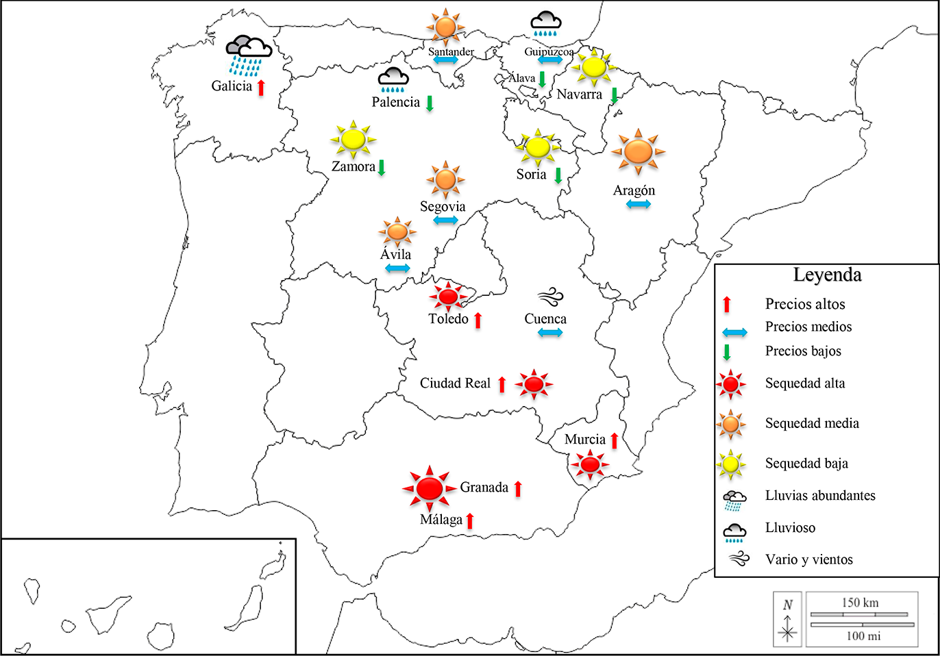 Gran parte de las coyunturas económicas agrícolas se comprenden estudiando el clima como un factor histórico. Las sociedades campesinas se veían comprometidas con el descenso térmico y la variabilidad -muchas veces extrema- de la Pequeña Edad del Hielo.11 En el corto plazo, la pérdida de las cosechas desencadenaba la modificación de los precios y hambrunas (Flohn, 1981, pp. 312-313); aparte del incremento de la inanición entre las poblaciones, lo que debilitaba el sistema inmunológico y, por lo tanto, intensificaba la mortalidad. En la larga duración, el clima reducía la superficie cultivable, fomentaba migraciones a tierras más fértiles y dificultaba la accesibilidad a alimentos básicos, con la consecuente subida de su valor económico (Parry, 1978, pp. 138-142). Los expertos mencionados anteriormente inauguraron los estudios que han reconstruido la evolución de los precios de productos y zonas de la península Ibérica. Sin embargo, estos explicaron las fluctuaciones por factores exclusivamente económicos y no consideraron las causas climáticas, perspectiva que resulta imprescindible para la Edad Moderna.