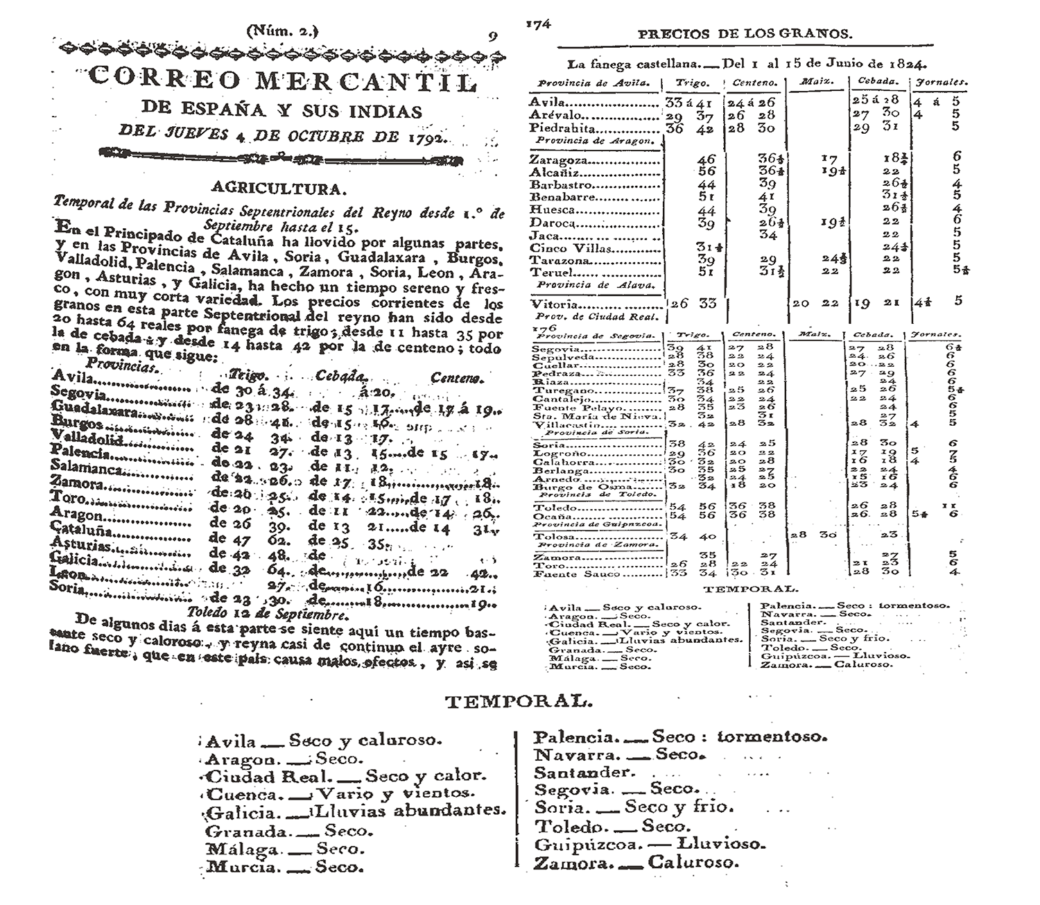 ABSTRACT: The main objective of this article is to present a case study referring to the temporal located in the Mercurio de España, dated June 1824. This section of the newspaper, which did not reappear again, constitutes a climatic and economic indicator from which it is possible to identify the types of cereals sold in Spanish cities and provinces and to know how the prices of wheat, barley, corn, and rye fluctuated as a consequence of climatic oscillations. It was a usual relationship among contemporaries, which was manifested in the publication of short-lived papers and newspapers that have gone unnoticed by historians. For this work, data was extracted and analyzed to know which cities and provinces had the cheapest and most expensive products. The interest of these results -we believe- does not lie so much in their climatic character -but also- in the capacity to approach the economic reality of cereals that constituted the food base of the population.