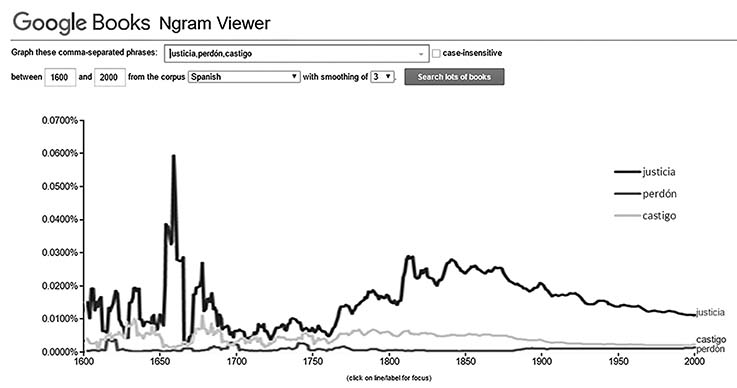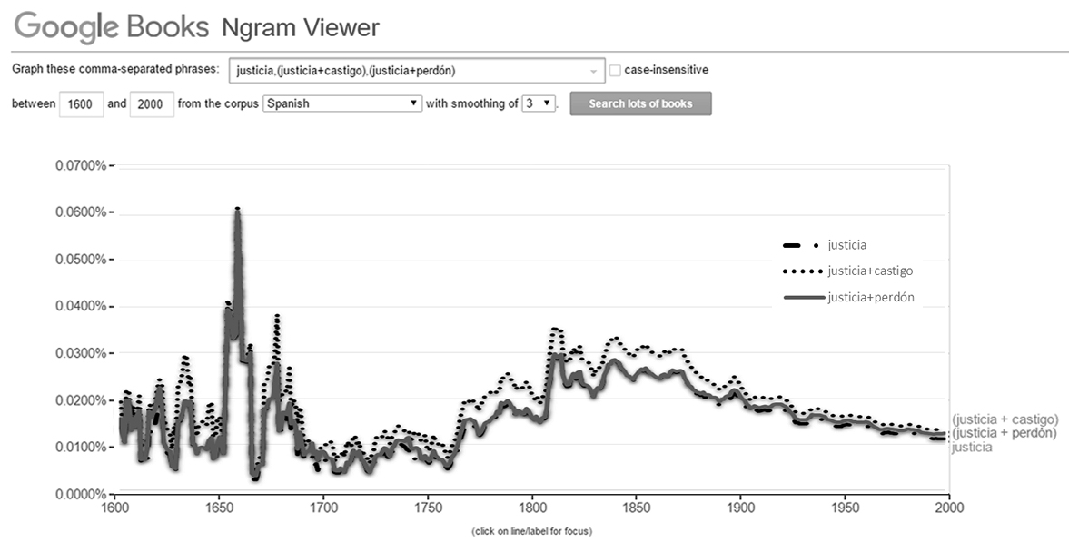 La figura 1 es una consulta simple que muestra las relaciones entre tres palabras que representan cada una un concepto: justicia, perdón y castigo. El ejercicio de leer el diagrama puede ser sencillo y podría reflejar un significativo interés por la “justicia” hacia la segunda mitad del siglo XVII y durante prácticamente los dos siglos que van de 1750 a 1950; la tarea por seguir podría ser explorar los lotes de libros de esos años o realizar operaciones combinadas entre n-gramas. Por ejemplo, si en lugar de buscar por cada concepto por separado realizamos la pesquisa de la relación entre justicia+castigo y justicia+perdón el resultado cambia significativamente como se observa en la figura 2.