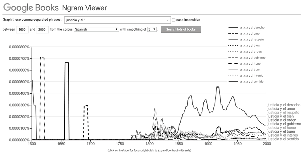 En este caso, figura 3, ya no es el lector quien indica a la máquina exactamente qué buscar sino es la máquina la que lee por el usuario e indica cuáles son las unidades de lenguaje más recurrentes en el lote de libros durante el tiempo consultado. Por ejemplo, me indica la presencia de la idea de “la justicia y el bien” en un lote de libros que va de 1613 a 1620, de “la justicia y el sentido” entre 1656 y 1661, y una interesante tendencia que inicia en 1768 y que terminará dominando hacia mediados del siglo XIX como es la frase “la justicia y el derecho”. Claramente esta “lectura” genera muchos interrogantes y campos de observación, como el periodo de 1770 a 1850, lo cual evidencia de alguna manera la eclosión de ideas que se vivió en el mundo hispanohablante en la época.