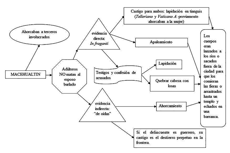 Fray Diego de Landa60explica que al adúltero se le ataba a un palo y lo entregaban al marido; si él lo perdonaba quedaba libre, si no, lo mataban dejándole caer una gran piedra sobre la cabeza (véase cuadro 1).