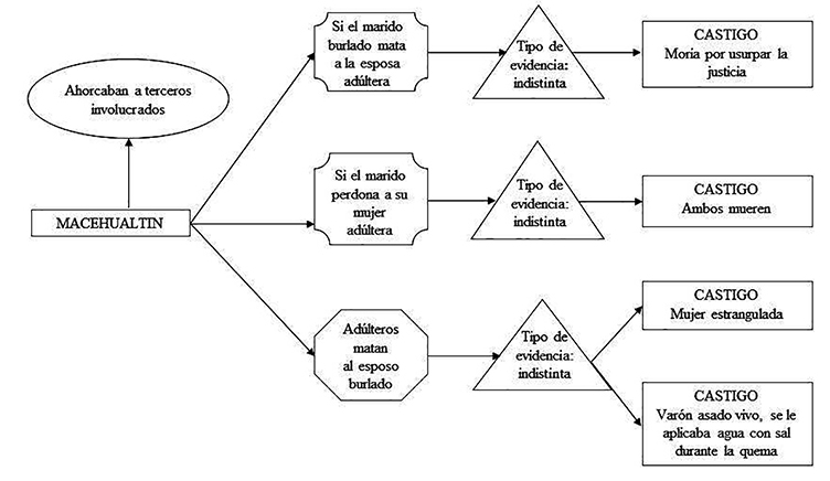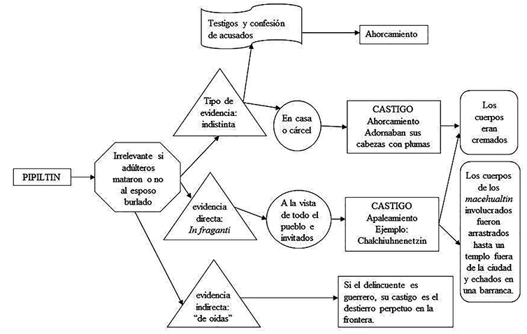 Para evitar el falseamiento de declaraciones, la ley exigía la comprobación del delito, pues el solo testimonio del marido era tenido por nulo, por ello no se ejecutaba la condena hasta la averiguación del caso. En dicha averiguación era necesario que otros testigos imparciales confirmaran las afirmaciones del marido y también era requerida la confesión de los acusados.38Asimismo, todas las personas involucradas en un crimen de adulterio eran condenadas a muerte. Ello incluye las alcahuetas39quienes eran condenadas sobre la base de evidencia indirecta y su pena era el estrangulamiento (véase esquema 1.40