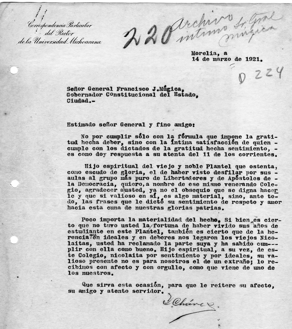 Imagen 5. Carta de Ignacio Chávez a Francisco J. Múgica, 14 de marzo de 1921. El rector reconoce las convicciones y la actitud de Múgica hacia la educación universitaria en el estado