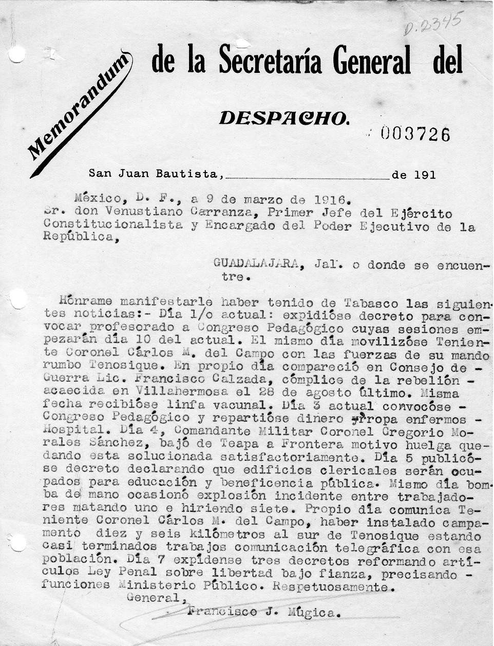 Imagen 3. Memorándum del 9 de marzo de 1916, donde Múgica informa sobre la realización del Congreso Pedagógico de Tabasco y la confiscación de edificios clericales para espacios educativos
