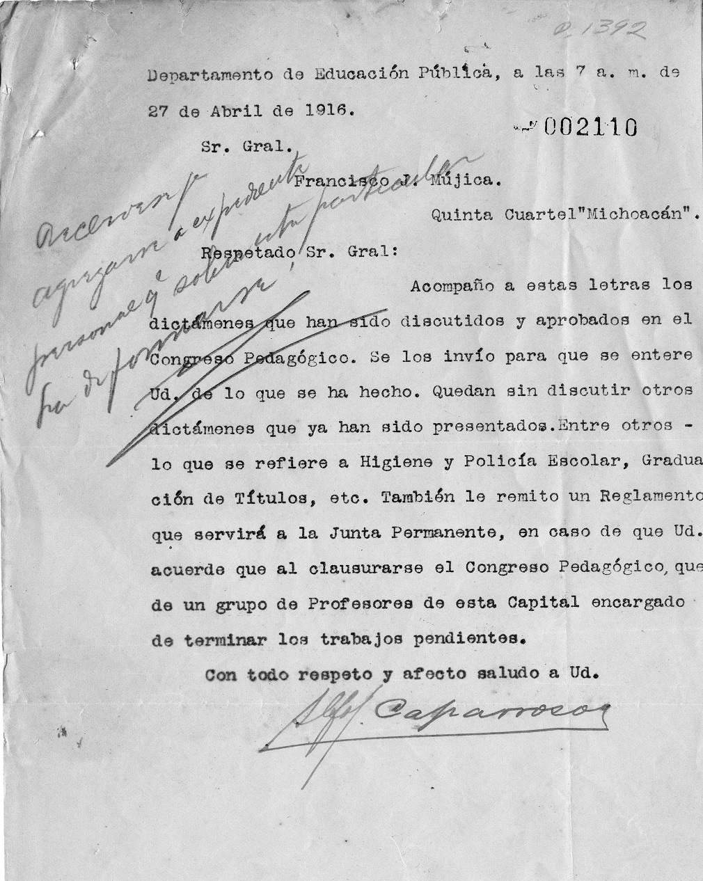 Imagen 2. Carta de Alfonso Caparroso a Múgica el 27 de abril de 1916 relacionada con el Congreso Pedagógico en Tabasco