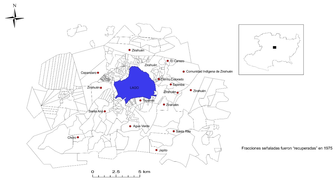 Fuente: con base en un mapa de los comuneros de Zirahuén con datos de la propiedad agraria actual. INEGI.