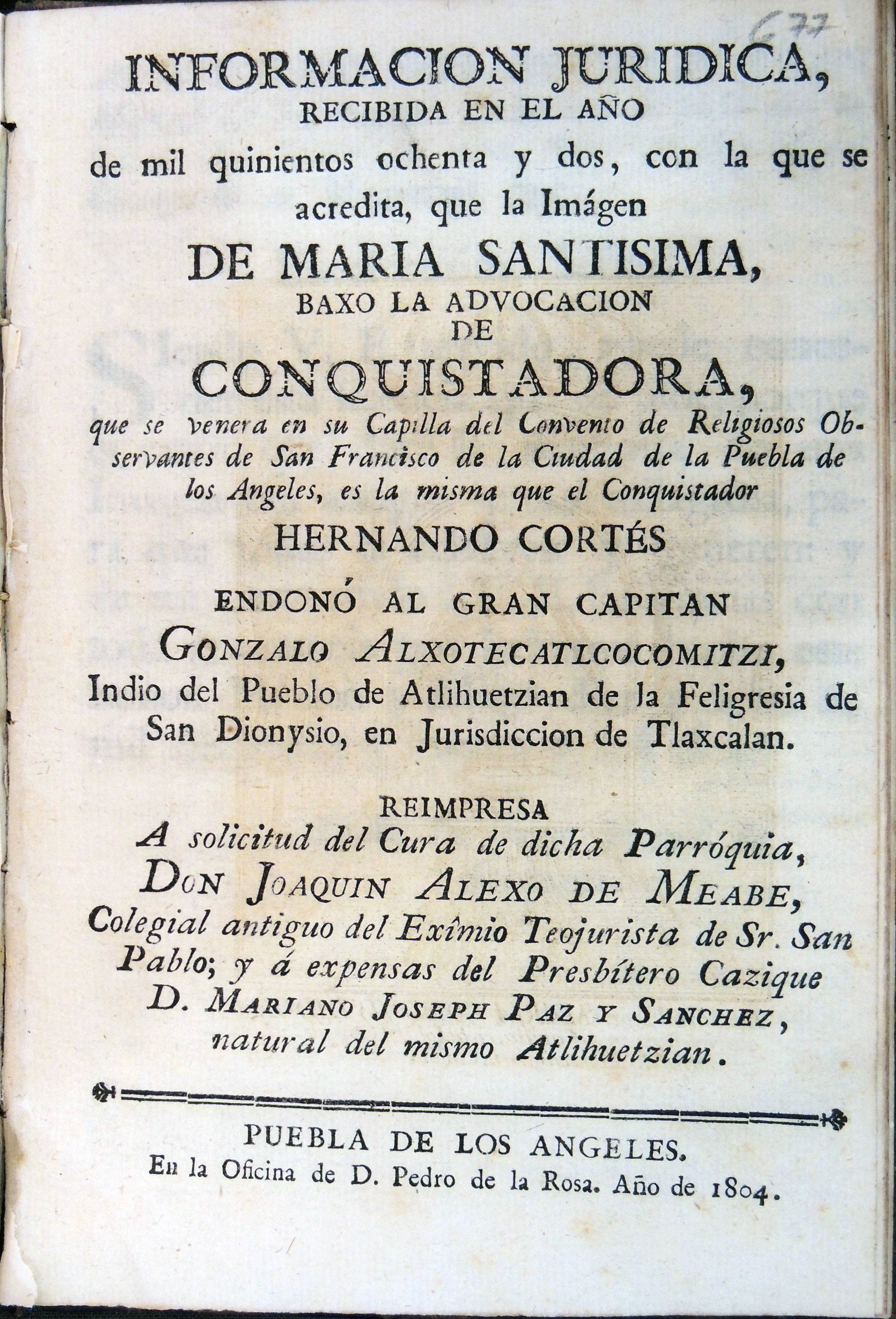 Información Jurídica recibida en el año de mil quinientos ochenta y dos con la que se acredita, que la imagen de María Santísima baxo la advocación de Conquistadora, que se venera en su Capilla del Convento de Religiosos Observantes de San Francisco de la Ciudad de la Puebla de los Ángeles, es la misma que el Conquistador Hernando Cortés endonó al gran capitán Gonzalo Alxotecatlcocomitzi, Indio del pueblo de Atlihuetzian de la Feligresía de San Dionysio, en Jurisdicción de Tlaxcallan. Reimpresa a solicitud del Cura de dicha Parroquia, Don Joaquín Alexo de Meabe, Colegial antiguo del Eximio Teojurista de Sr. San Pablo; y a expensas del Presbítero Cazique D. Mariano Paz y Sánchez, natural del mismo Atlihuetzian. Puebla de los Ángeles: en la oficina de D. Pedro de la Rosa. Año de 1804.