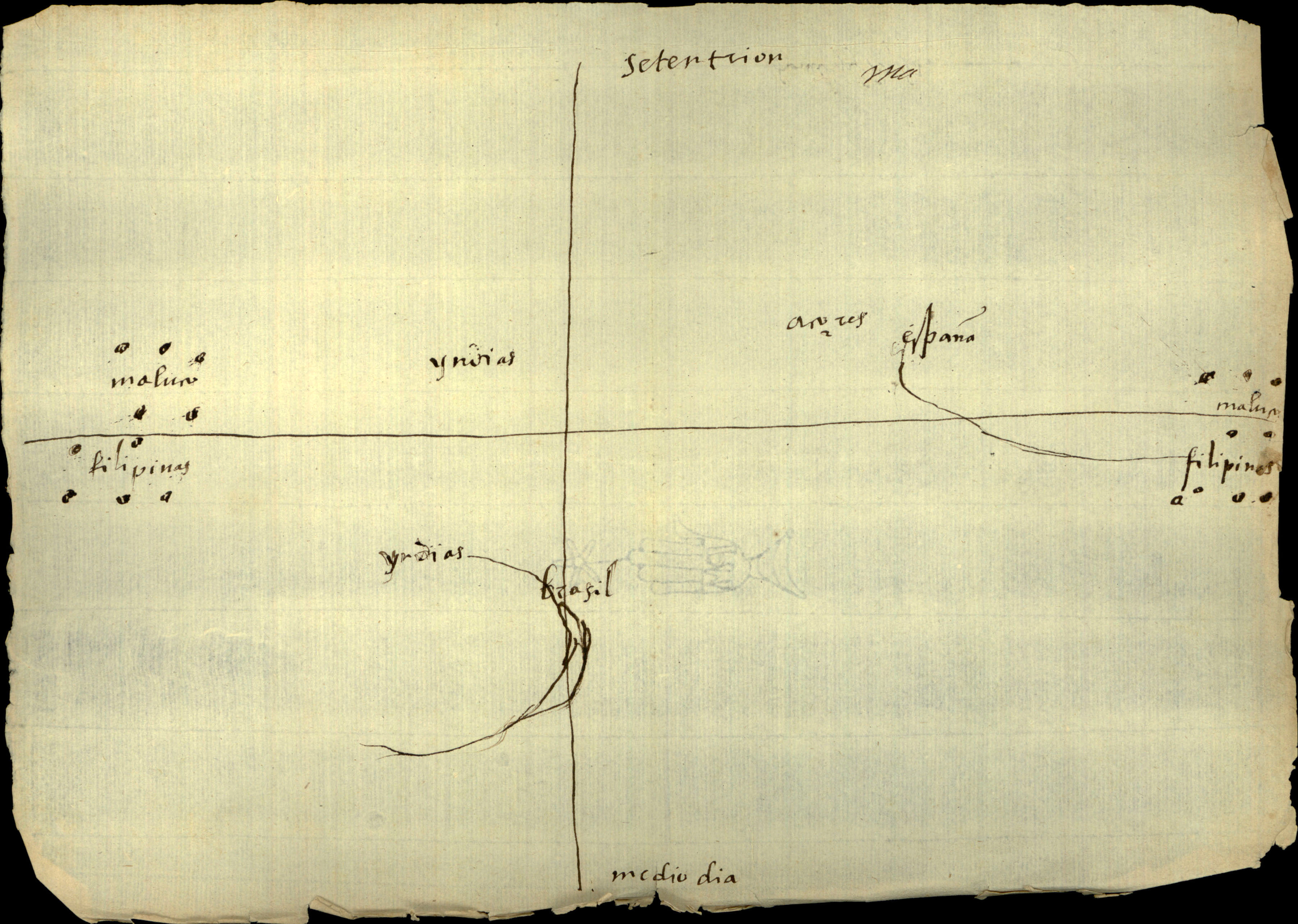 El asombroso croquis-mapamundi que acompaña el parecer insistía en la idea que Filipinas y Molucas pertenecían ambos a la demarcación española; se reduce enormemente la amplitud del océano Pacífico y esta región se hace un apéndice de las Indias occidentales. Este dibujo recuerda las representaciones medievales del mundo -como el globo de M. Benhaim de 1492-, dado que el continente americano está presente sólo con la palabra “yndias”: estrechar el Pacífico fue una constante hasta muy avanzado el siglo XVI.9 Además, las Molucas aparecen al norte (lo que es totalmente inexacto), ligeramente al este, de Filipinas, así que si las Molucas pertenecían al empeño español, también lo eran las Filipinas. La tachadura acerca de la línea del Tratado de Tordesillas en Brasil apoya la idea de una usurpación portuguesa en aquella parte.