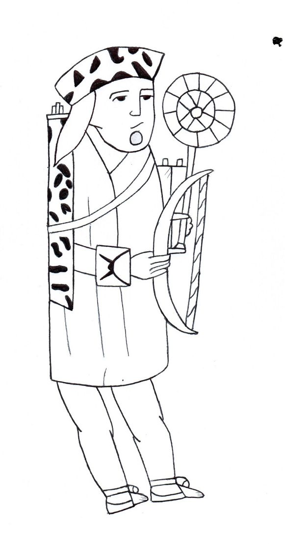 Figura 1. El cazonci electo porta los distintivos de su rango: la “guirnalda” de piel de jaguar, un carcaj de piel del mismo felino, un arco y dos flechas