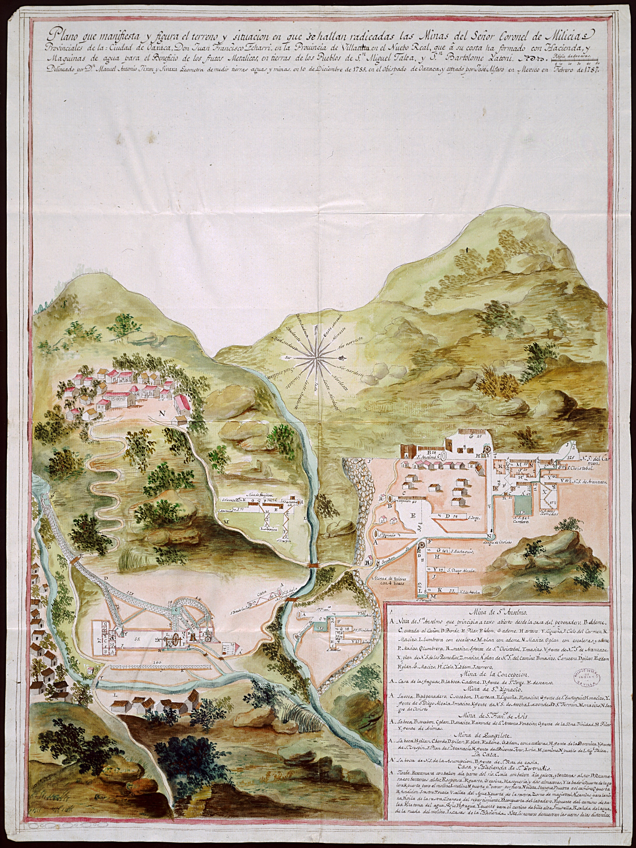 El 25 de mayo de 1782, Juan Francisco Echarri escribió desde el Real de Talea una carta al virrey de la cual se sacó copia para el Tribunal de Minería. En ella, agradecía la llegada de azogue a Veracruz, “ingrediente tan necesario para el real a su cargo”. A continuación, exponía que con mucha fatiga, debido a las “ásperas montañas” y la carencia de gente con pericia en la materia, había empezado a “laborear” minas descubiertas por él desde el mes de noviembre de 1779. Enfatizaba que lo había hecho con tesón y “a costa de inexplicables desvelos, trabajos personales en instruir, vencer dificultades y muchos pesos” que desde entonces había gastado. Se vanagloriaba de no haber perdido “un pueble hasta la fecha” y que se mantuvo sin desmayo frente a las “fuertes borrascas” que se le presentaron, todo con “el fin de fundar e imponer a los del país 24 barreteros desde el real de Taxco”.26 Señaló que con la misma constancia y esfuerzo había emprendido el año pasado de 1781 la construcción de una hacienda y sus oficinas para beneficiar metales.27