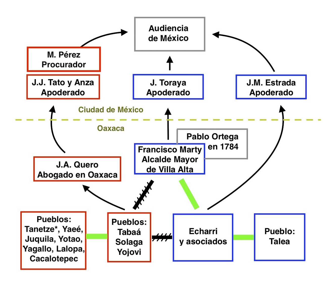 Volviendo al esquema, por encima del recuadro está Francisco Marty, quien fue alcalde mayor de Villa Alta hasta inicios de 1784. Hasta que no fue presentada la denuncia contra Echarri, Marty había delegado completamente a éste y a sus dependientes la gestión de las tandas de repartimiento. Intervino para forzar a los pueblos a cumplir con los requerimientos del trabajo en el complejo minero de Talea. A principios de 1783, cuando se vio superado por la situación y como respuesta a las múltiples quejas de los pueblos, Marty pidió autorización a la Audiencia de México para nombrar un “sujeto que en calidad de juez de las minas entienda en todo cuanto su necesidad, con instrucción y facultades necesarias para su más cabal manejo”.56 Con ello, intentó hacerse a un lado de la gestión del conflicto. Finalmente, se ubican los apoderados de Francisco Marty y de Echarri, puesto que la Audiencia estableció su asociación como acusados cada uno presentó el suyo. La línea negra gruesa con rayas transversales significa la confrontación entre los pueblos y el minero Echarri, mientras que las verdes indican la asociación entre los componentes de cada una de las partes. Finalmente, las líneas negras con flechas muestran el vínculo entre los actores locales y sus representantes en la ciudad de Oaxaca y en la Ciudad de México.
