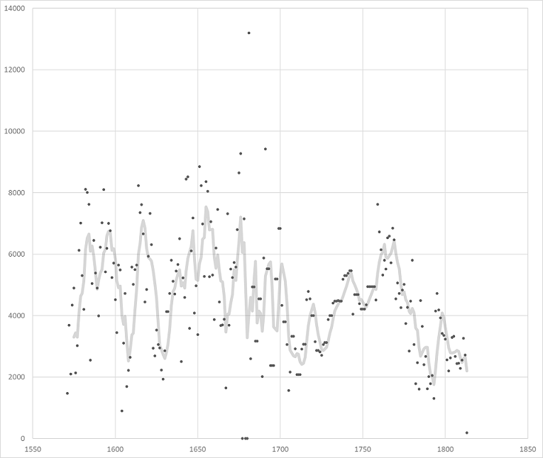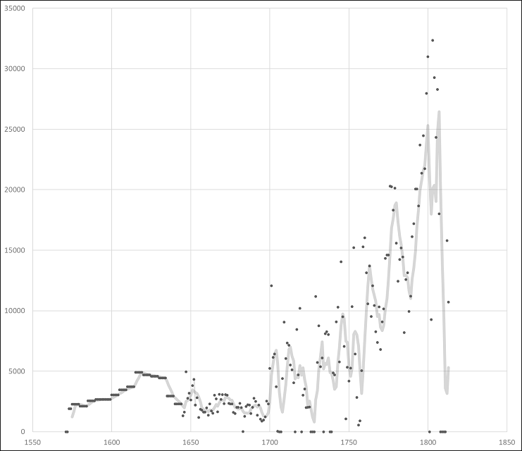 Desde finales del Medievo, Almadén fue explotado por asentistas. En 1525, Carlos I (1516-1556) concedió el asiento a los Fúcares. En 1645, pasó a depender directamente de la administración real (Lang, 1977, pp. 63-65; Matilla Tascón, 1986, pp. 304-305). La transición implicó un deterioro en la producción de la mina durante el resto del siglo [Gráfico 2]. La producción no se recuperó sino hasta la dinastía Borbón.