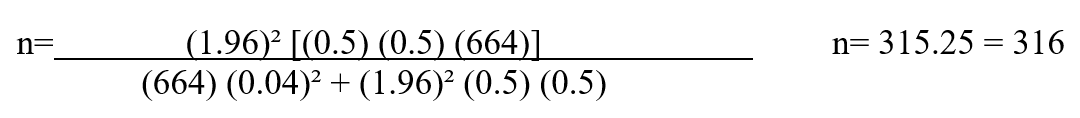 La muestra es representativa, con una confianza de 95% y margen de error de 4%, se utilizó la fórmula de Díaz, Ojeda y Valderrábano (2016):