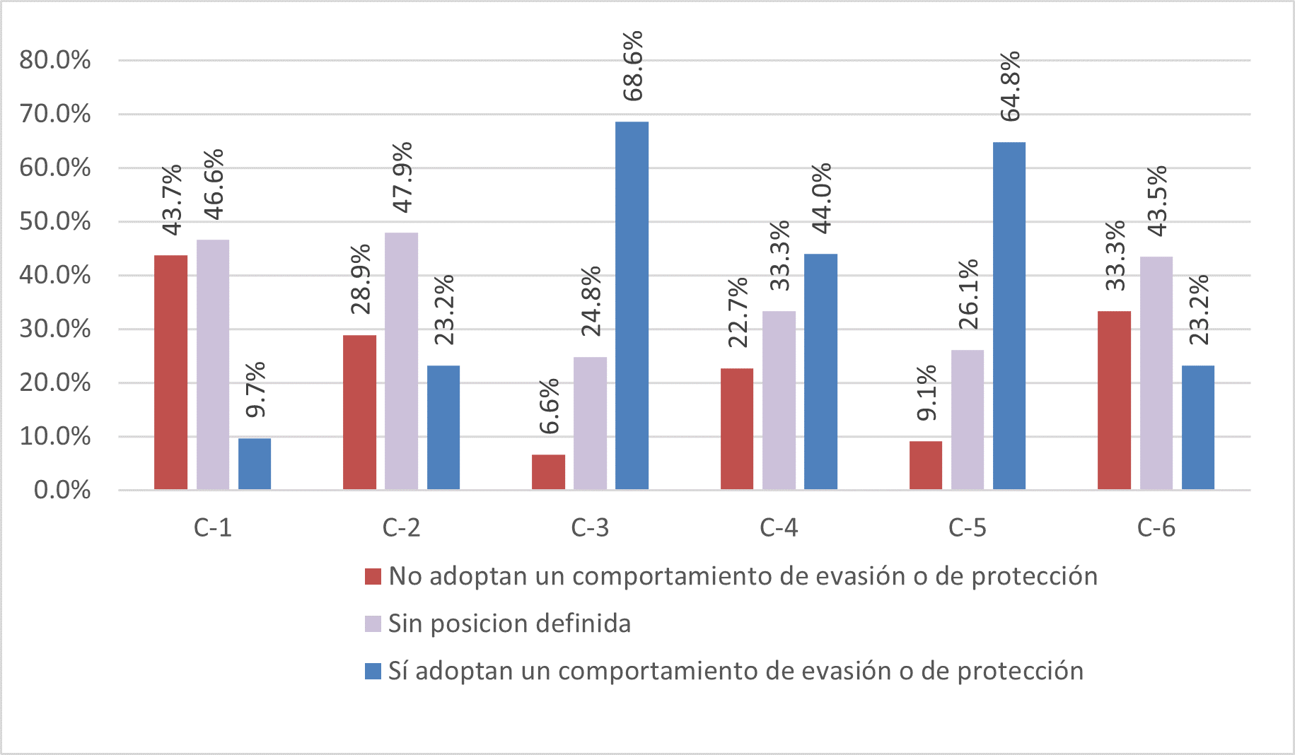 En términos globales, se encontró que en promedio ponderado 50.2% de la muestra adopta hábitos de protección al asistir al Paseo del Ángel durante la noche, lo cual les permite mitigar la sensación de miedo (ver Gráfico 3); estos hábitos refieren a evitar las calles alrededor del corredor comercial (C3), llevar consigo objetos de defensa personal (C4), sólo asistir en compañía (C5), y no consumir fuera de los establecimientos del Paseo (C6). Aparentemente la ponderación es igual para los comportamientos de protección y evasión; sin embargo, respecto a este último, sólo 9.7% declaró haber dejado de asistir al Paseo en horario nocturno (C1), y 23.2% redujo sus visitas; entendiéndose que existen resistencia en los jóvenes a dejar de vivir el ocio nocturno, teniéndose que la principal consecuencia evidenciada es la adopción de hábitos que brinden la sensación de seguridad cuando se encuentran consumiendo o socializando en este lugar, es decir, una recuperación del control en su vivencia nocturna.