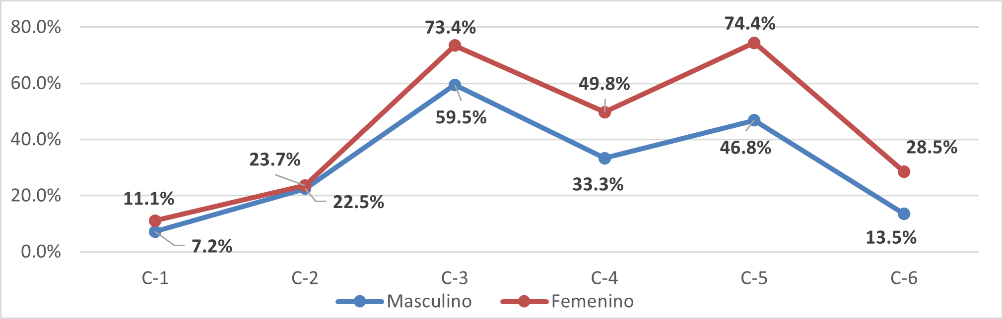 La segunda opción de estrategia más utilizada para continuar disfrutando en el entretenimiento nocturno del Paseo del Ángel es asistir únicamente en compañía de otras personas (C5), 64.8% de la muestra así lo expresó considerando que son blancos más fáciles de delincuentes si van solos. A su vez, 44% de los estudiantes declaró utilizar objetos de defensa personal (C4) pero, al desglosarlos por género, encontramos que son las féminas quienes utilizan mayormente estos objetos (sin ahondar en el tipo de estos). El Gráfico 4 evidencia que las mujeres registran los indicadores más altos respecto a los comportamientos de evasión o protección, indistintamente de cuál sea, compaginándose con los datos del Gráfico 2 que muestra que son las féminas quienes se sienten más vulnerables en el entretenimiento nocturno que se desarrolla en el Paseo del Ángel.