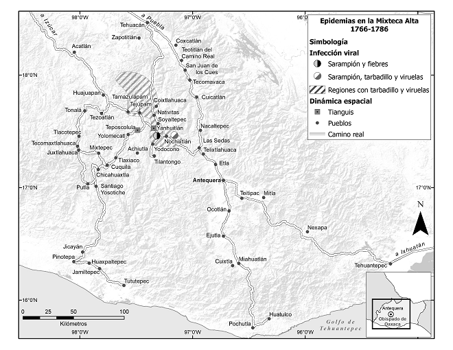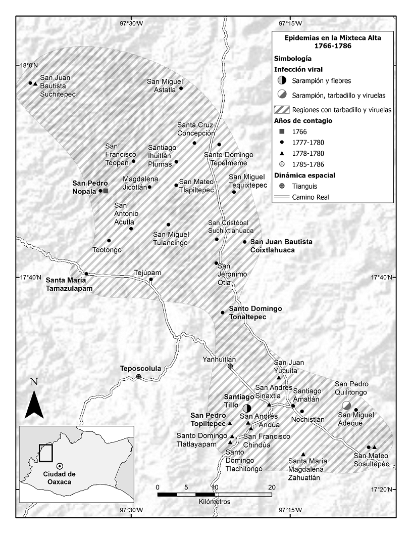Una pregunta central es ¿De dónde procedían las enfermedades que asolaron a los habitantes de la Mixteca Alta? Hasta el momento, no se ha podido esclarecer el origen del sarampión y tabardillo, siendo distinto para el caso de la viruela. Chantal Cramaussel refiere que este padecimiento, que azotó a los pobladores de Nueva España de 1778 a 1782, se originó en las Costas de Estados Unidos en 1775, y pasó por Luisiana y el este de Texas. La autora refiere que la viruela llegó por el puerto de Veracruz, cuando arribó un viajero procedente de las islas del Caribe, en donde esta epidemia estaba presente. La enfermedad se propagó por la Ciudad de México, Toluca, Ixtlahuaca, Atlacomulco y Zinacantepec (González, 2013, p. 170). Pasó al obispado de Michoacán, Valladolid, Guadalajara y el norte del virreinato (Cramaussel, 2010, pp. 14-15).