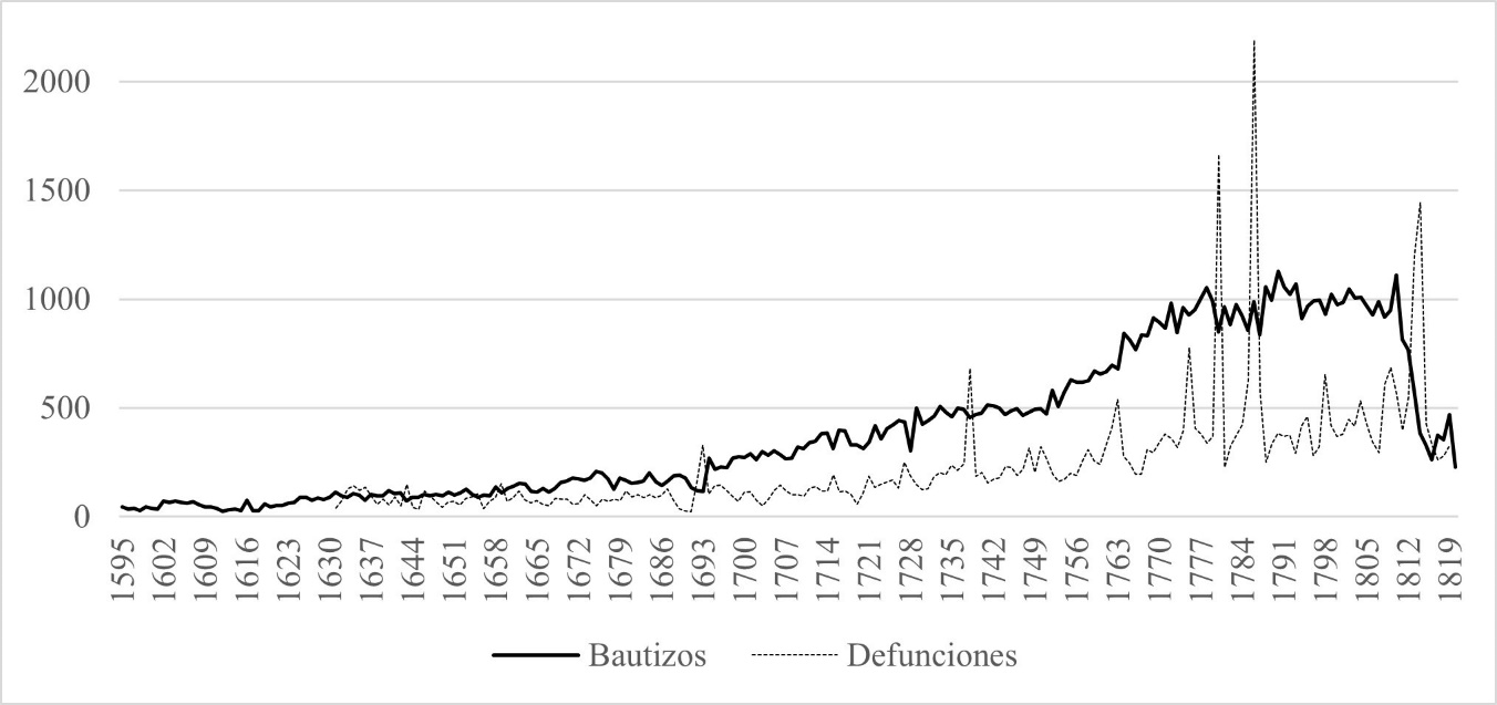 El abordaje en el presente trabajo se hace a través de la Historia Demográfica. La mortalidad, la fecundidad y la movilidad son los procesos que determinan la formación, la conservación y la desaparición de las poblaciones humanas en el tiempo (Livi-Bacci, 1993, pp. 9-10). La mortalidad -en particular la catastrófica- jugó un papel más importante que la fecundidad, lo que generó un lento crecimiento (Canales Guerrero, 2006, pp. 68-69). Las defunciones fueron el regulador por excelencia del crecimiento demográfico y por lo tanto de la evolución de la población (Perrenoud, 1989, pp. 13-14). El periodo de estudio de este trabajo se ubica antes de la “transición demográfica”, cuando se tenían altas tasas de fecundidad y de mortalidad, (Reher, 1999, pp. 290-291) y antes de la “transición epidemiológica”, una era dominada por la pestilencia y la hambruna, con alta mortalidad fluctuante, con una expectativa de vida baja y variable entre 20 y 40 años (Omran, 2005, pp. 736-738). La historia demográfica da cuenta de los elementos vitales de una sociedad. Las personas del pasado, en su gran mayoría no dejaron mayor testimonio en los archivos y fondos documentales, salvo sus registros de bautismo, defunción y matrimonio.