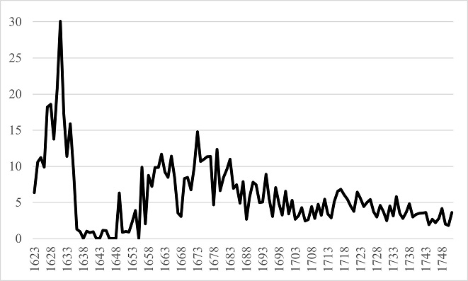 | 1615-1624 | 3.1 | 19.0 | 69.3 | 6.5 | 1.7 | 99.5 | 2.3 | 38.1 |