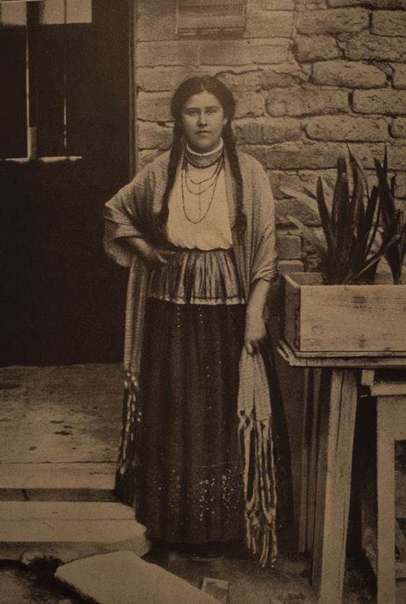 La portadilla del libro de Landenberger es una foto en blanco y negro de una joven mestiza mexicana, vestida con un traje típico al estilo china poblana: blusa blanca, rebozo de seda portado en forma elegante, con una mano en la cintura y la otra dejando caer con suavidad el rebozo; lleva una falda ornamentada con un fruncido triple en la parte superior de diversos tonos, adornada con chaquira hasta la parte inferior; de su cuello cuelgan tres o cuatro collares de diverso largo. Sus dos largas trenzas bien peinadas caen hasta la cintura al lado de su apacible y armónico rostro (véase Figura 1). No sonríe, pero su rostro sugiere un gesto de sonrisa. Tanto la gestualidad de la mujer como su atuendo nos muestran una visión elaborada y artística. Sus ojos se dirigen directamente a la cámara con una mirada tranquila. El fondo de la foto parece el patio de una casa. El pie de foto dice: “Eine Schönheit aus dem Volke” (Una belleza del pueblo). Así comienza el autor su libro de andanzas en México, con la mirada de una mujer y su propia mirada hacia esa mujer. Las primeras palabras de su prólogo parecen complementar esta vista: “Con gran gusto he vivido en el país romántico de México” (Landerberger, 1925, p. 3).1