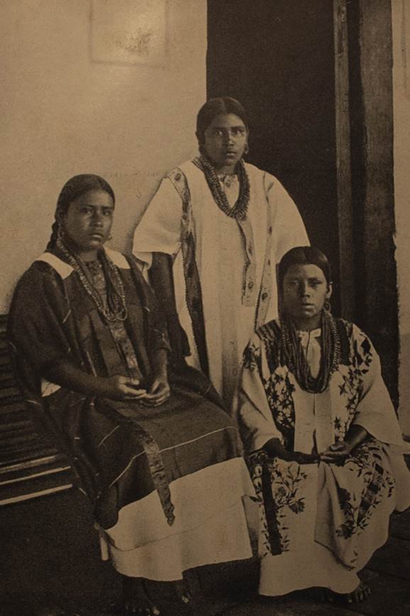El contraste entre las actividades y ocupaciones de las mujeres según su raza y grupo social es constante en el libro de este autor y esto lo muestra muy claramente en diversas fotos que incluye en su libro. En una hay un grupo de siete niñas sentadas alrededor de una mesa bordando bajo la vigilancia de dos maestras y un hombre que observa al fondo; el pie de foto indica “Bordadoras en Veracruz” (véase Figura 2). En otra, vemos un elaborado retrato de tres mujeres indígenas de Amatlán, Veracruz, elegantemente vestidas con huipiles y, como era costumbre, descalzas, (véase Figura 3) posan para el fotógrafo con elegancia natural, una parada, otra sentada sobre una banca y la tercera sobre un banco pequeño; todas miran directo a la cámara con porte de gran señorío. Los tres niveles de altura en que Landenberger las sitúa permite admirar sus rasgos individuales con nitidez.