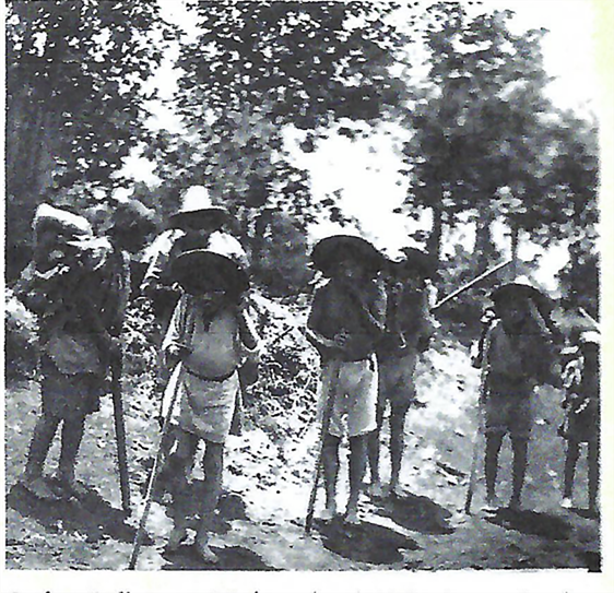 B. Traven señala que las mujeres tienen un papel esencial en el desarrollo económico, social y cultural en los diversos grupos de esta área de México; pero al igual que Landenberger y Goldschmidt, indica que en general su rol tiende a ser discreto, “escondido” o relegado a un segundo plano en relación a los hombres, a pesar de que en algunos grupos indígenas las mujeres caminan la misma distancia y cargan el mismo número de pacas con mercancía y peso que sus compañeros varones, e inclusive a veces casi no llega a distinguirse la vestimenta o rasgos físicos de los hombres. El pie de foto de un grupo de indígenas Oxhuc que camina por la sierra hacia el mercado dice: “La mujer, tan fuerte y resistente como los hombres, carga con un fardo de cosecha igual de pesado, a pesar del recorrido de unos 50 km, siempre por senderos de alta montaña” (1928, p. 10) (véase Figura 5).3