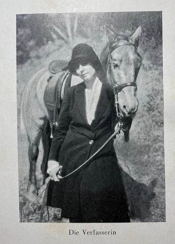 Como primer punto, destaca la diferencia entre las portadillas descritas de los libros de Landenberger y Goldschmidt con mujeres mexicanas, cuya edad y porte contrastante no demerita el atractivo de su otredad femenina, desde el punto de vista de estos autores germanoparlantes. La portadilla del libro de West muestra, en comparación, una foto de autor desconocido, también en blanco y negro, con la figura de una joven elegantemente vestida al estilo europeo, con un traje fino; lleva un sombrero de equitación y sobresale su porte distinguido, junto con un aura de control. En lugar de posar luciendo un rebozo y con el puño de su mano derecha recargado en la cintura, haciendo un triángulo con el brazo y el codo hacia adelante como las mujeres mexicanas, la figura femenina de la portadilla en el libro de West está parada junto un caballo, cuya rienda sostiene con determinación y en la otra mano parece sostener las bridas del animal para mantenerlo bajo control. Al pie de la foto se lee “La autora” (véase Figura 8).