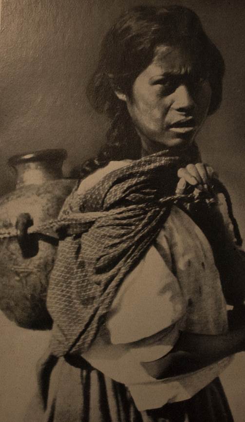 Aparte de las más de veinte fotografías incluidas en su libro, la mayoría de su autoría, las ilustraciones, dibujos sencillos pero dinámicos, quizá hechos a lápiz, que acompañan cada capítulo con una imagen acorde al tema tratado, parecen ser originales de West, aunque no se indica la autoría en el libro. Resulta curioso que, además de la portadilla con la foto de la autora, las únicas otras representaciones visuales femeninas son el dibujo que inicia el capítulo sobre las soldaderas, que consiste en el rostro oscuro y serio de una indígena, y la foto, con crédito a la agencia Mantel-México, de una indígena con rostro adusto y ceño fruncido que carga un jarro de agua en la espalda (véase Figura 9); su mirada casi agresiva parece rechazar la toma de foto, su gestualidad corporal expresa el esfuerzo físico de la carga, y su rebozo y ropa sencilla contrastan con la elegante figura de la autora en la portadilla. El contraste entre estas dos representaciones femeninas parece abismal.
