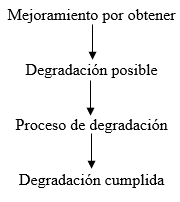 En general, la novela Tierra Caliente constituye un proceso de degradación teniendo como protagonista a Pedro; sin embargo, este no es lineal, antes bien existen breves momentos de mejoraría que prolongan la narración, pero sobre todo alimentan el interés del lector. Dentro de la tipología de los procesos de degradación esta novela responde al modelo por enclave según el cual el fracaso de un proceso de mejoría resulta de la inserción de uno inverso. Bremond (1970), representa así dicho modelo: