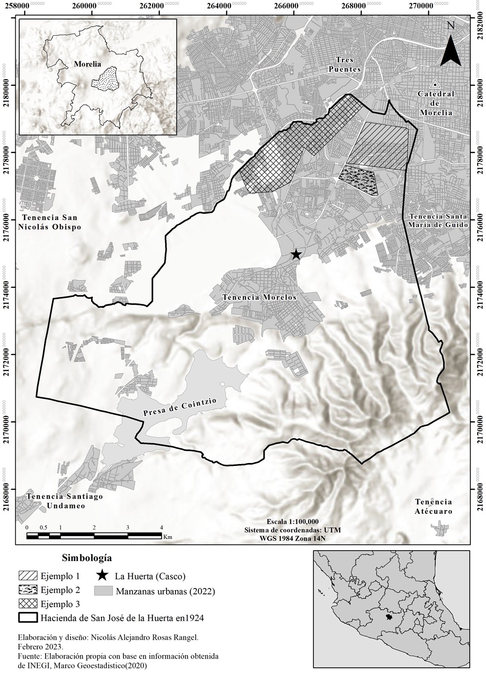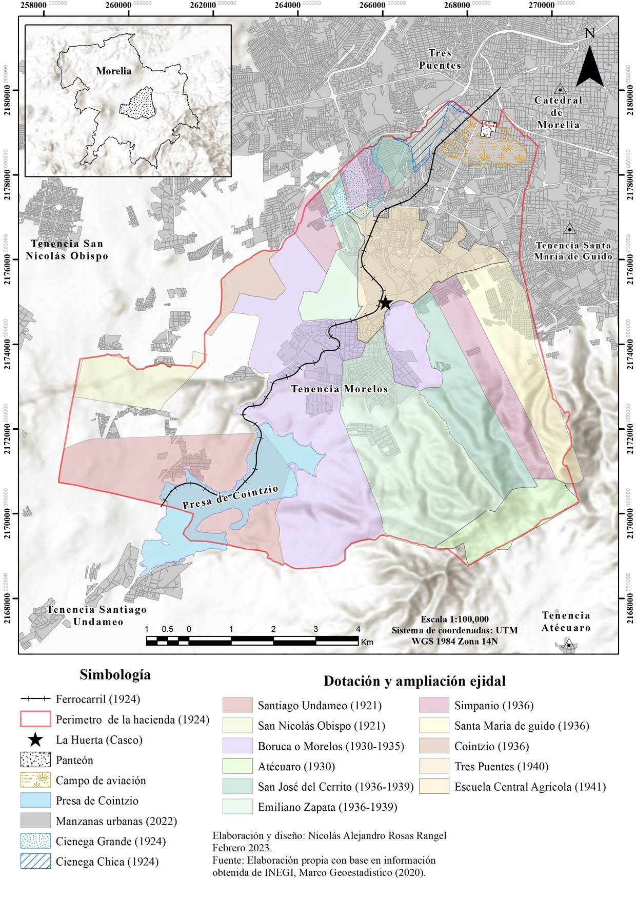 Como lo demuestra esta breve contextualización, el territorio se encuentra en una constante transformación y reconstrucción a lo largo del tiempo, adaptándose a las nuevas necesidades y a los intereses que la sociedad ejerce sobre este. A través de distintos procesos e intervenciones, la hacienda San José de la Huerta dio origen a los ejidos de Santiago Undameo, San Nicolás Obispo, Boruca (Morelos), Atécuaro, San José del Cerrito, Emiliano Zapata, Simpanio Norte, Santa María de Guido, además de las ampliaciones de Cointzio y de Tres Puentes [ver Figura 2].