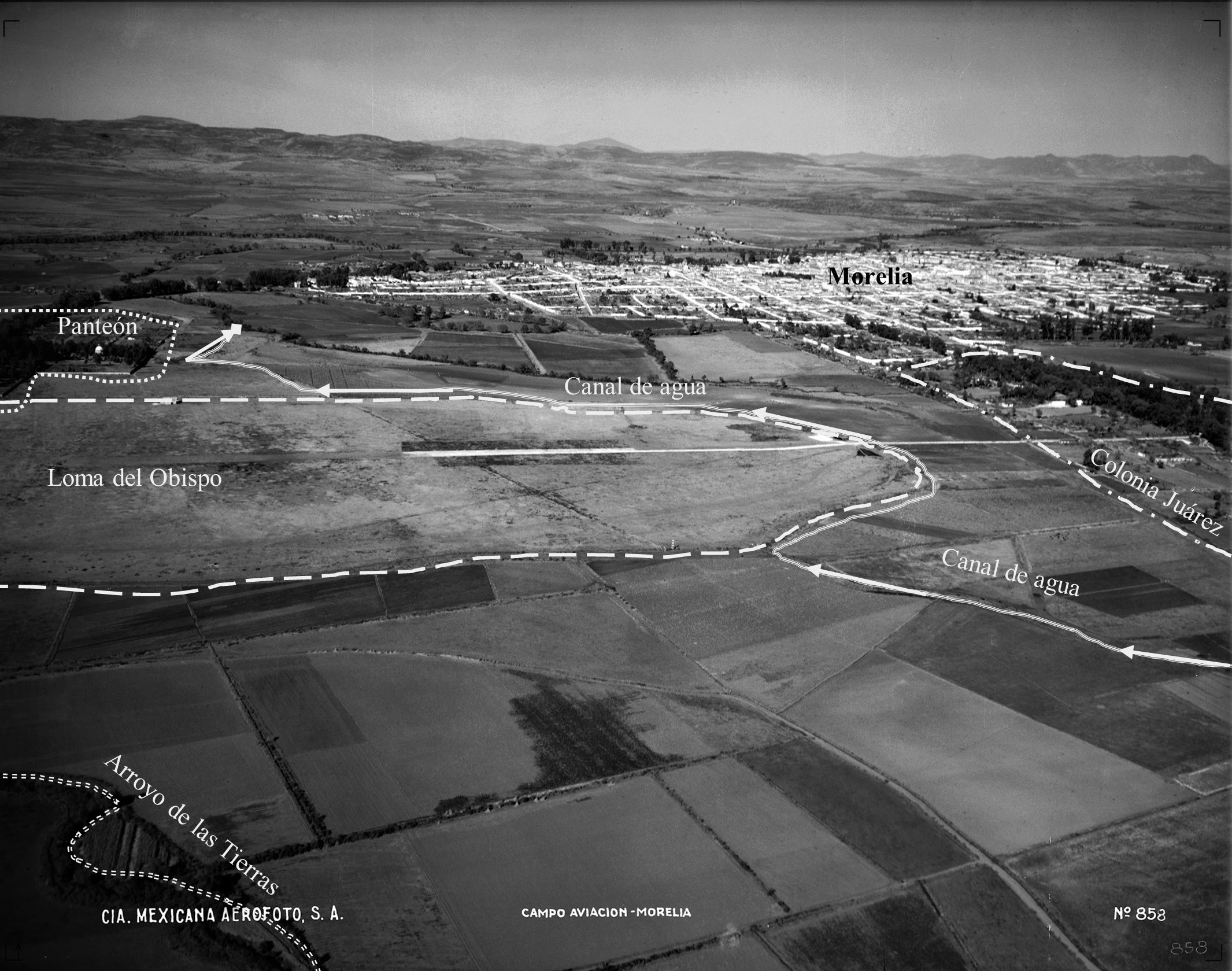 Asimismo, junto al panteón, se creó un campo de aviación con la donación de 70 hectáreas de terreno en el predio llamado Loma del Obispo (Resolución, 1936a). La fecha de la cesación del territorio no es conocida, pero esta ocurre entre 1926, año de creación de la escuela, y 1931.8 Una fotografía oblicua, fechada de 1933 [ver Figura 3], tomada de sur a norte, muestra información de mayor alcance acerca del impacto de la construcción de esta infraestructura. Se observa parte del arroyo de las Tierras; al centro de la imagen la Loma del Obispo, entonces ya transformada en el campo de aviación de la ciudad de Morelia; en la derecha parte de la construcción de la colonia Juárez; a la izquierda el panteón; mientras que al fondo se logra apreciar el centro histórico de Morelia. También podemos ver que, a pesar del gran cambio en la tenencia y uso de la tierra que ha sufrido Loma del Obispo, la forma de la parcela permanece inalterada.