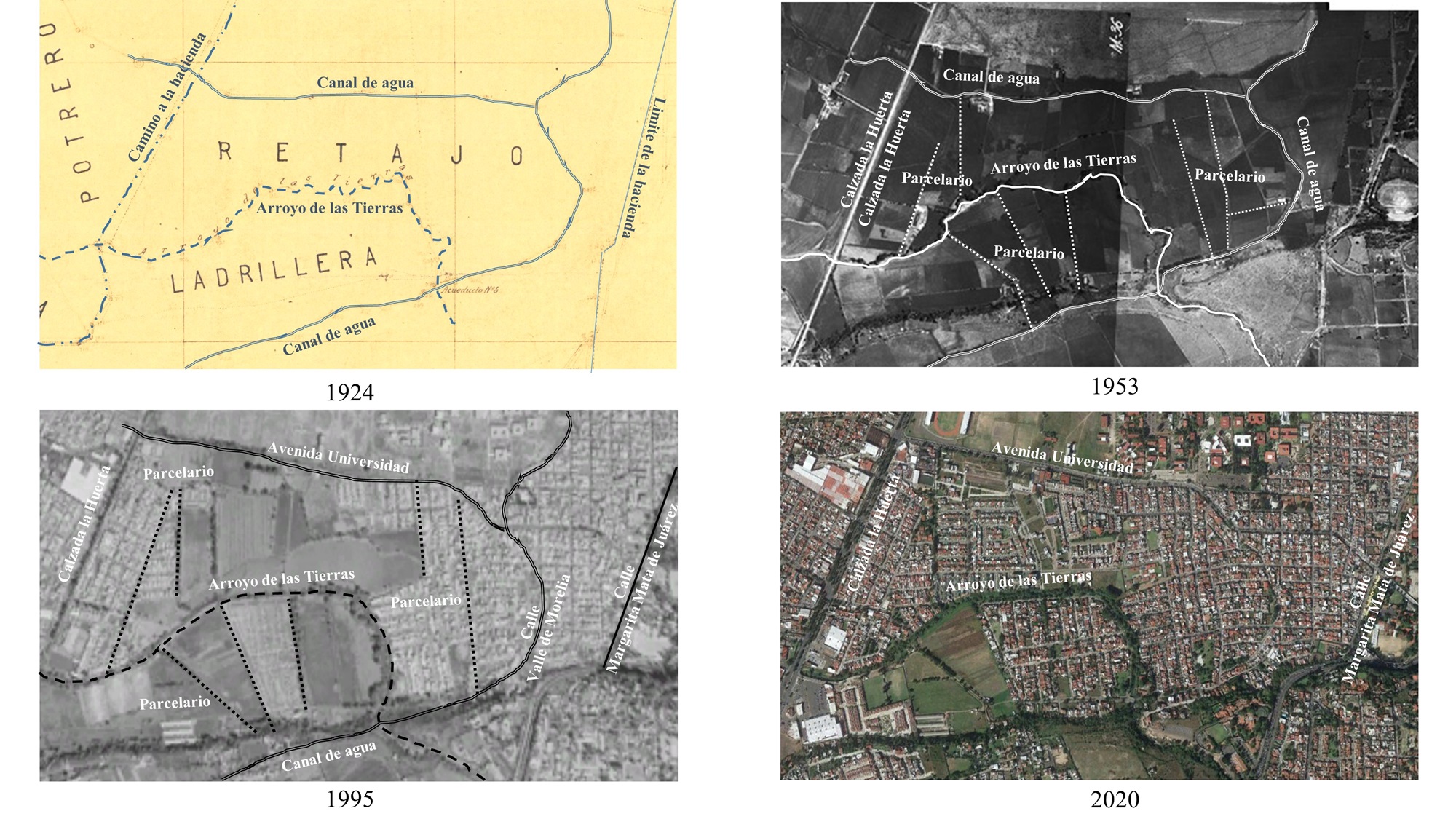 Para cada zona analizada, se rastrearon las transformaciones morfológicas observadas a través del tiempo, desde 1924 (con los mapas históricos) hasta la actualidad, utilizando las etapas cronológicas que permite la documentación histórica: 1933 y 1953 (aerofotos de la Fundación ICA), 1995 (ortoimagen de INEGI), y 2020 (imagen satelital de Google Earth). El destino de las formas antrópicas se contrastó con los acontecimientos sociales, económicos y políticos que pudieron haber influido en ellas.
