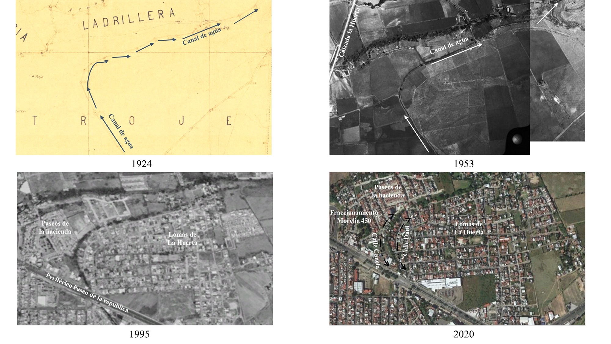 Las imágenes satelitales del año 2020 muestran que el curso del canal quedó plasmado dentro del ámbito urbano, con las líneas de árboles atestiguando la presencia previa de la infraestructura. Lo anterior evidencia que la forma planimétrica de este ducto de agua se conservó, no así la morfología. En efecto, aunque el INEGI menciona que para 2017 el canal seguía en operación, una visita de campo y las mismas imágenes satelitales desmintieron dicha información, o por lo menos demostraron que en 2021 el panorama era diferente. El canal fue seccionado; algunas partes se convirtieron en calles y otras se mantuvieron. Sin embargo, su función parece haber cambiado: las observaciones in situ mostraron que se convirtió en un canal de drenaje para facilitar el flujo de agua durante la temporada de lluvias y para evacuar las aguas negras de los edificios que se construyeron en sus linderos.11 Al mismo tiempo, también funge como límite entre la colonia Lomas de la Huerta, y los fraccionamientos Morelia 450 y Paseo de la Hacienda. Su trazado sirvió de base para delimitar ambas colonias y guiar el bosquejo de calles, fosilizando la forma de este antiguo acondicionamiento agrícola.