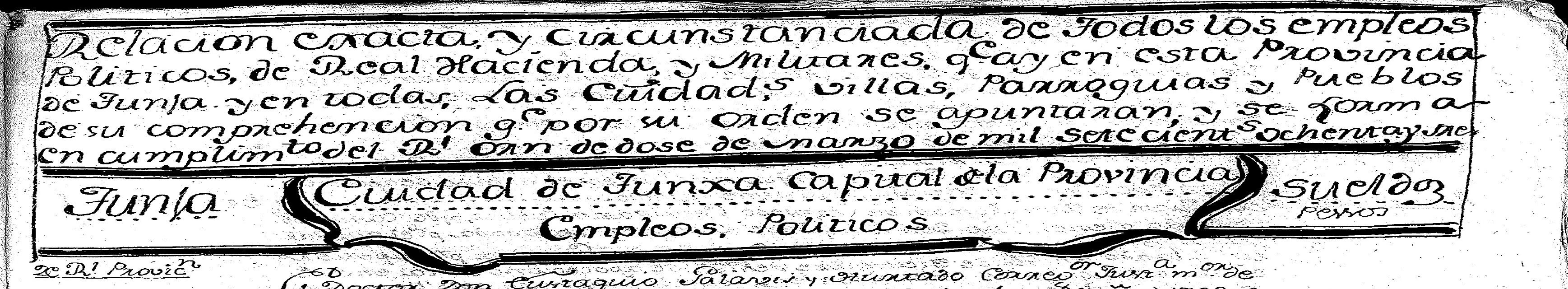 Un documento tal vez plano, dirían algunos “muy burocrático”, y que lleva por título completo, “Relacion exacta, y circunstanciada de todos los empleo Politicos, de Real Hacienda, y Militares, que ay en esta Provincia de Tunja y en todas, Las Ciudades, villas, Parroquias y Pueblos de su comprehencion que por su orden se apuntaran, y se forma en cumplimiento del Real orden de dose de marzo de mil setecientos ochenta y tres” (en adelante Relación exacta). Consta de 8 folios (16 páginas) y goza de una excelente caligrafía en letra bastardilla. Es la versión original del mismo y al parecer del puño y letra de su autor. Su estado de conservación es excelente, excepto por algunos traspasos de tinta que no representan dificultades relevantes para su lectura.