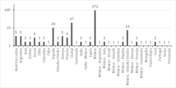 Cabe mirar también los ámbitos geográficos y las temáticas publicadas en Relaciones. Aunque México y sus regiones es el espacio geográfico que destaca en 72 % de los trabajos publicados (372 de 519 artículos), poco a poco se han ido publicando artículos que cubren otras geografías así como regiones binacionales o lugares de frontera. Destacan los trabajos sobre América Latina y los países de la región (5 %), Europa y países de la región (7 %), y en menor medida Asia y Japón (1 %). Un 5 % está dedicado a Estados Unidos o a las relaciones entre México, Estados Unidos y Canadá. Finalmente, la variable que aparece en la gráfica como global (9 %), hace referencia a aquellos textos que discuten problemas teóricos o metodológicos y que carecen de un ámbito geográfico determinado.