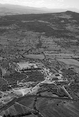 FIGURA 2. Fotografía aérea de Peralta destaca en el paisaje el conjunto de Doble Templo y patio hundido y el Recinto de los Gobernantes con la estructura circular a la izquierda del patio hundido
