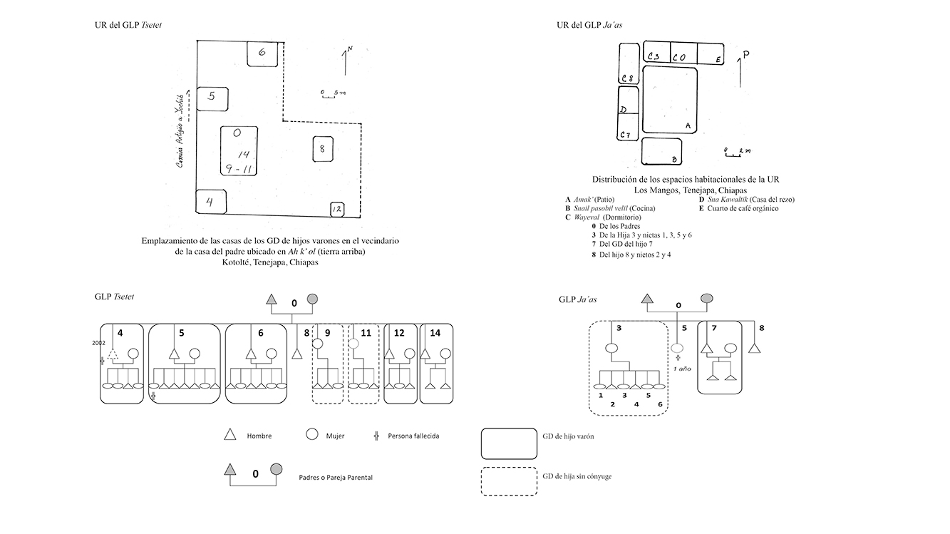 Si los GLP Tsetet y Ja’as se proyectan en un periodo de tiempo mayor, las parejas parentales de estos grupos inicialmente fueron GD articulados a grupos de parentesco instaurados por sus padres. Al igual que los GD de sus hermanos se establecieron como un grupo de consumo independiente dentro de la vecindad de su padre por un periodo de tiempo, para luego formar su propio GLP manteniendo una residencia contigua con los grupos de sus hermanos y el jol bil adquirido patrilinealmente, es decir, para constituirse en un grupo agnaticio localizado.31 Las formas morfológicas que se producen en el transcurso del ciclo de desarrollo de estos grupos domésticos, siguiendo a Robichaux (2002, 72), se rigen por principios específicos de la tradición cultural mesoamericana, a la que subyace un sistema de significados compartidos, que es inherente a toda cultura (Rodríguez 2006, 402), la cual puede “ser vista como soluciones socialmente heredadas a los problemas de la vida” (D’Andrade 1995, 249).