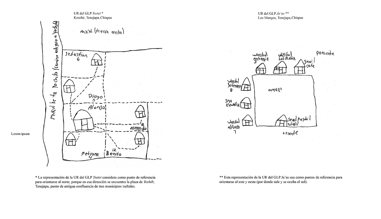 FIGURA 2. Representaciones de las UR de los GLP Tsetet y Ja’as, elaboradas por miembros de los grupos, que muestran la distribución de las casas de los grupos domésticos de hijos varones