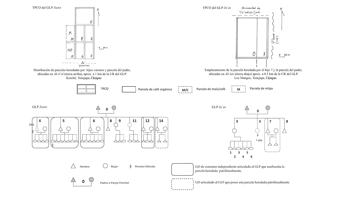 La figura 3 representa los territorios parcelarios de café orgánico (TPCO) de los GLP objeto de estudio y la estructura genealógica de estos grupos resultado de la práctica de la herencia patrilineal de la tierra. Los límites del TPCO del grupo de parentesco y de las parcelas a su interior están demarcados por mojones apenas perceptibles denominados en tseltal s’akan, dando la imagen al observador externo de una continuidad de áreas arboladas.
