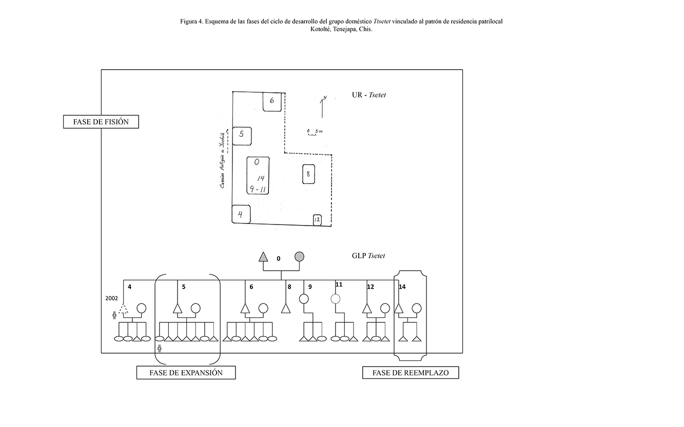 FIGURA 4. Esquema de las fases del ciclo de desarrollo del grupo doméstico Tsetet vinculado al patrón de residencia patrilocal Kotolté, Tenejapa, Chiapas