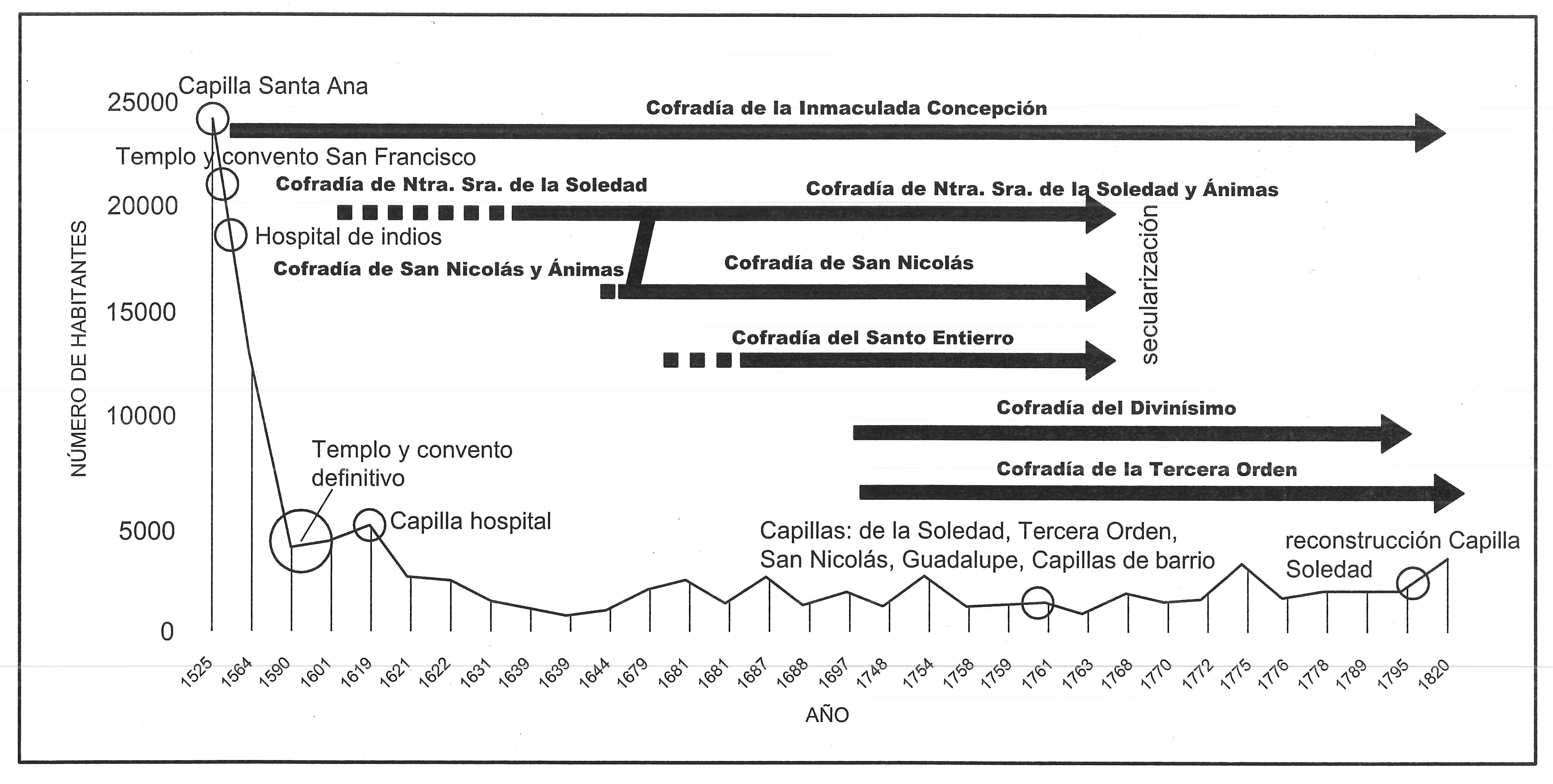 En este último documento es la primera vez que se hace referencia a la cofradía de Nuestra Señora de la Soledad y Ánimas del Purgatorio. El segundo nombre pertenecía a una hermandad fundada en la iglesia parroquial, la cual en 1665 estaba adherida a la cofradía de San Nicolás, y posteriormente se fusionó con la de la Soledad.49 Después de esa amalgama, la misma cofradía a veces era referida como de Nuestra Señora de la Soledad y otras como de las Ánimas del Purgatorio.50